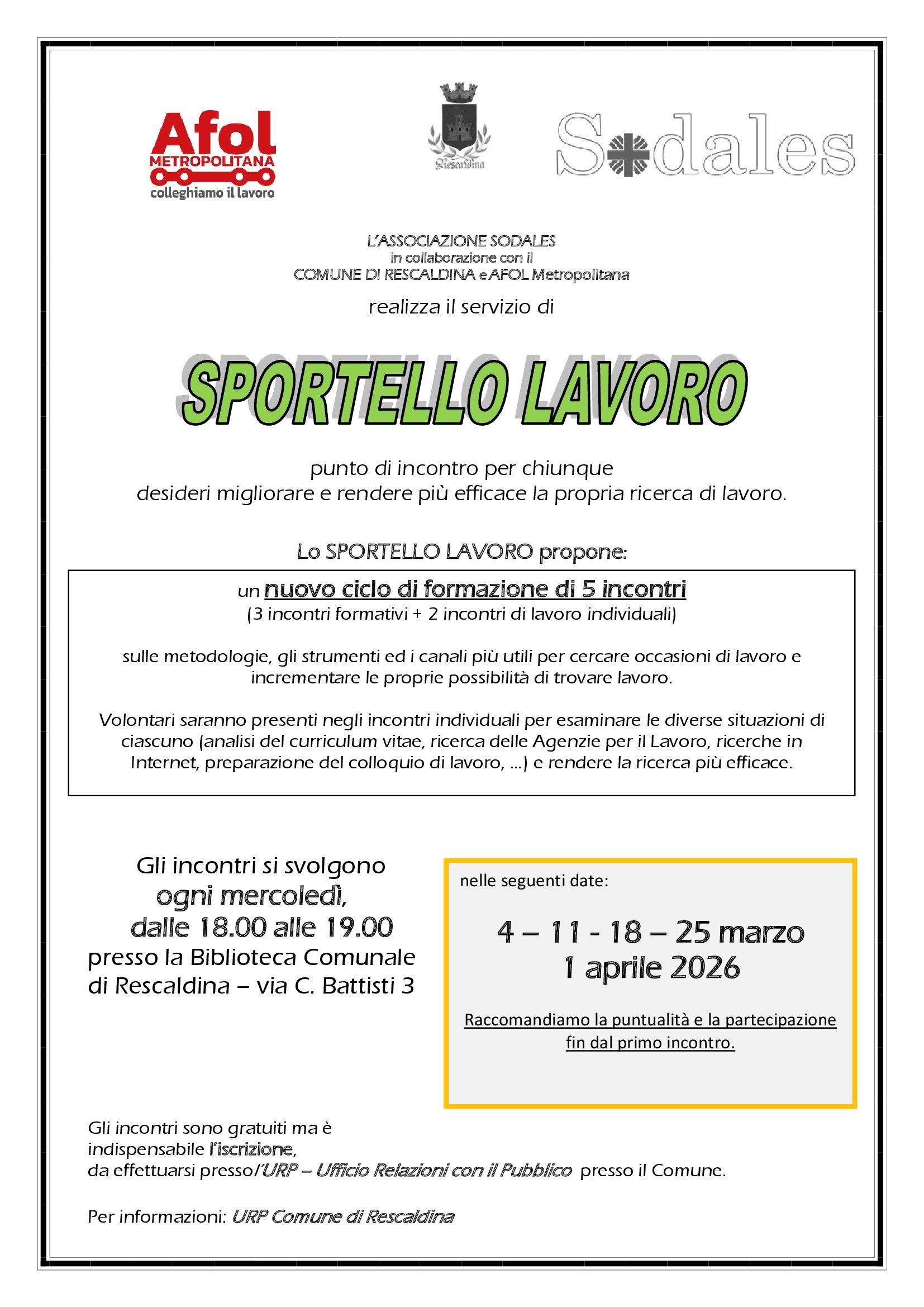 L'Associazione Sodales in collaborazione con il Comune di Rescaldina e AFOL Metropolitana realizza il servizio di Sportello Lavoro